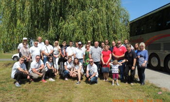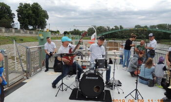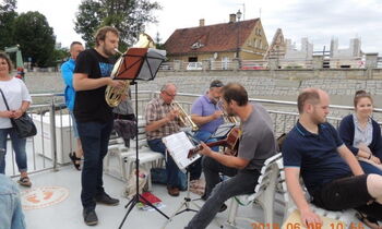Am Freitagnachmittag ging es in Richtung Polen los. Highlight des Treffens war ein gemeinsames Konzert auf dem Schiff, das zwischen Nowa Sól und Nowa Wieś und zurück gefahren ist. Das Repertoire für das Konzert wurde am Freitagabend von beiden Orchestern in Kożuchów geübt. Der Samstag wurde zusammen auf dem Schiff verbracht. Zum Glück war das Wetter sehr schön und der Wasserstand in der Oder ideal. Wir hatten vorher ein bisschen Bauchschmerzen, ob überhaupt so viel Wasser fließt, dass das Schiff fährt. Eine Pause wurde bei einem Winzer gemacht. Dort erwartete alle Teilnehmer und Gäste ein schön gedeckter Tisch mit leckeren lokalen Produkten. Außerdem wurde viel über das Weingut erzählt und gezeigt. Ausklang des Tages war ein gemeinsames Grillen mit fachlichen und interessanten Gesprächen. Am Sonntag fand ein Kirchgemeindefest in Kożuchów statt. Zum Ende des Projektes haben beide Orchester für die Einwohner der grenzübergreifenden Region, deren Gäste und Besucher ein Konzert gegeben. Die Bürgermeisterin Frau Röthig hat das Projekt begleitet.