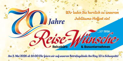 Die Firma Reise-Wünsche GmbH lädt am 03.05.2026 zum Jubiläumsfest mit Unternehmermarkt auf ihren Betriebshof ein.